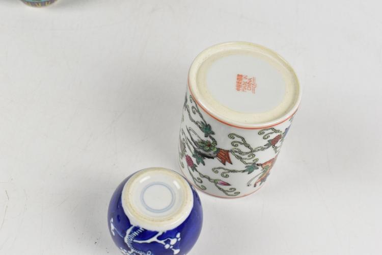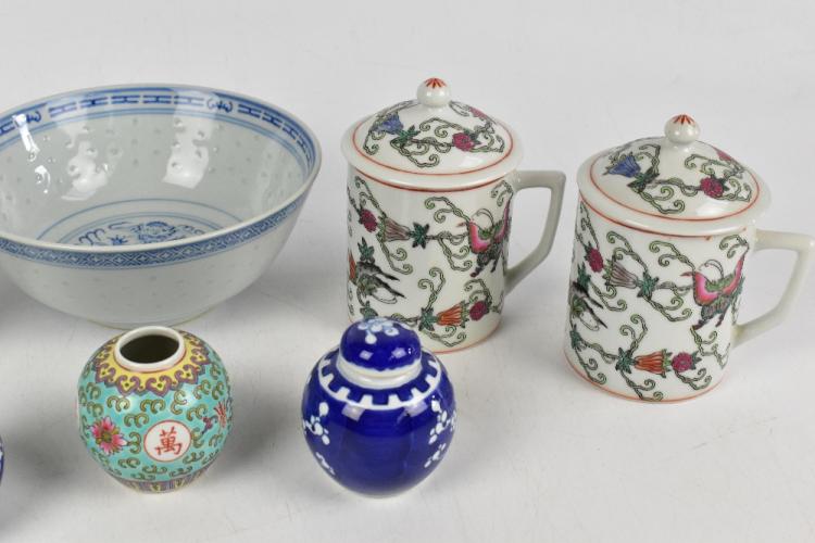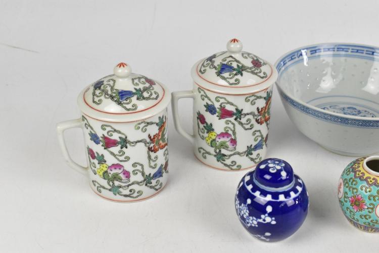Lot 41 of 2095: A set of four modern Chinese mugs and covers, decorated with butterflies and flowers, height 13.5cm, with two prunus pattern ginger jars and covers, a smaller blue ground ginger jar, and a rice bowl.