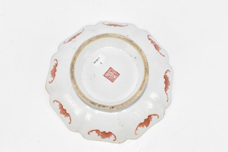Lot 50 of 2095: A 19th century Chinese porcelain footed bowl of octagonal form, decorated with stylised floral detail and bats to the centre within a ruyi-head border, the outer rim decorated with bats, iron red seal mark to underside, height 7cm, width 23.5cm.