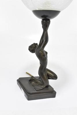 Lot 531 of 2095: An Art Deco style bronzed figural table lamp with associated frosted glass shade, modelled as a semi-nude maiden kneeling supporting the shade, overall height 39cm (shade af).