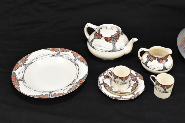 Lot 671 of 2095: CROWN DUCAL; seven pieces decorated in the 'Orange Tree' pattern together with an Art Deco glass plafonnier.