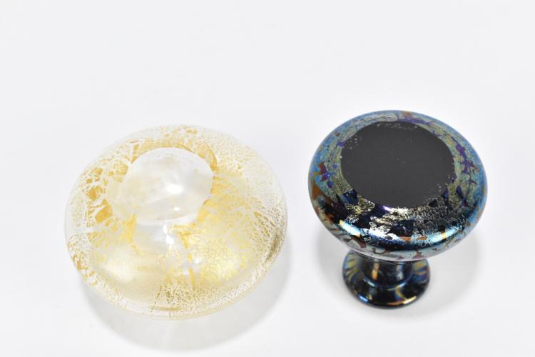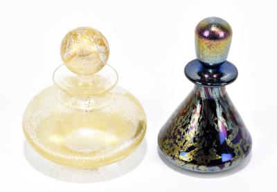 Lot 680 of 2095: CHRIS ROUSE FOR SHETLAND GLASS; two contemporary perfume bottles including a conical iridescent example, height 8cm (2).