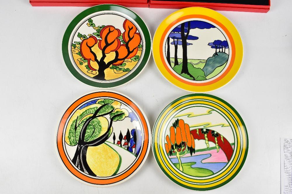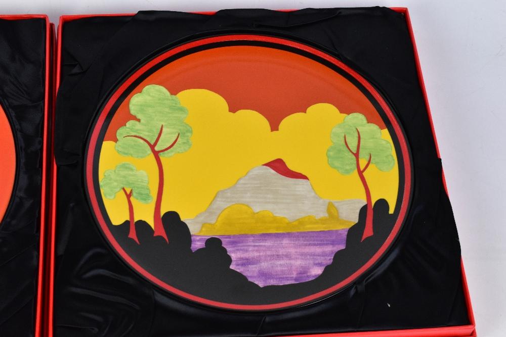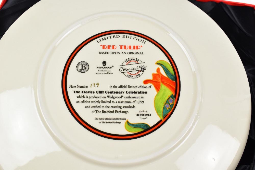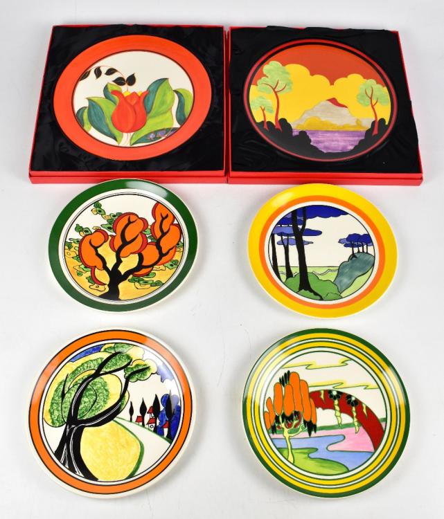 Lot 682 of 2095: BRADFORD EXCHANGE; two Wedgwood Centenary Clarice Cliff limited edition plates, one decorated with the 'Red Tulip' pattern, no.179, diameter 30.5cm, the other decorated with 'Etna', no.667, each boxed with certificate, with four unboxed 26cm plates, comprising 0236D 'May Avenue', 2477A 'Orange Erin', 0757B 'Blue Firs' and 347C 'Solitude'.