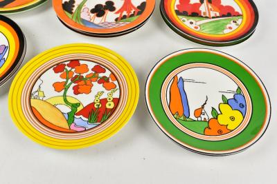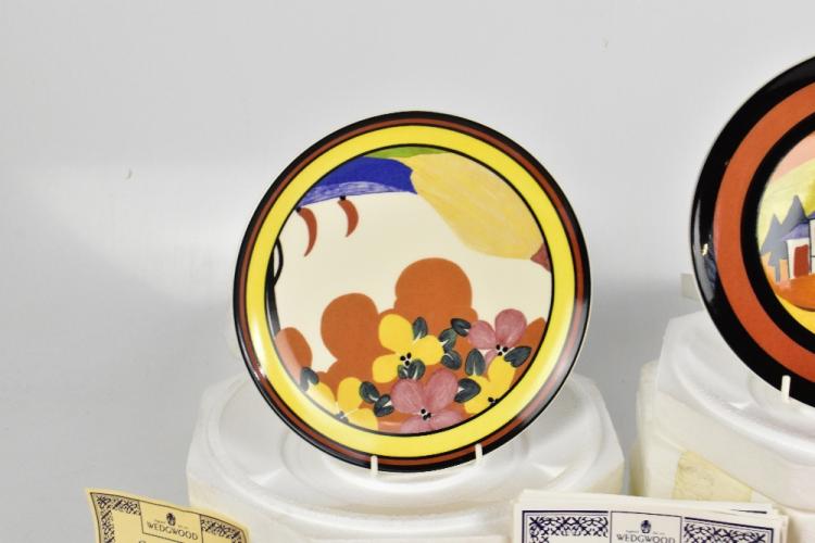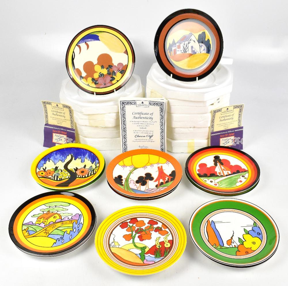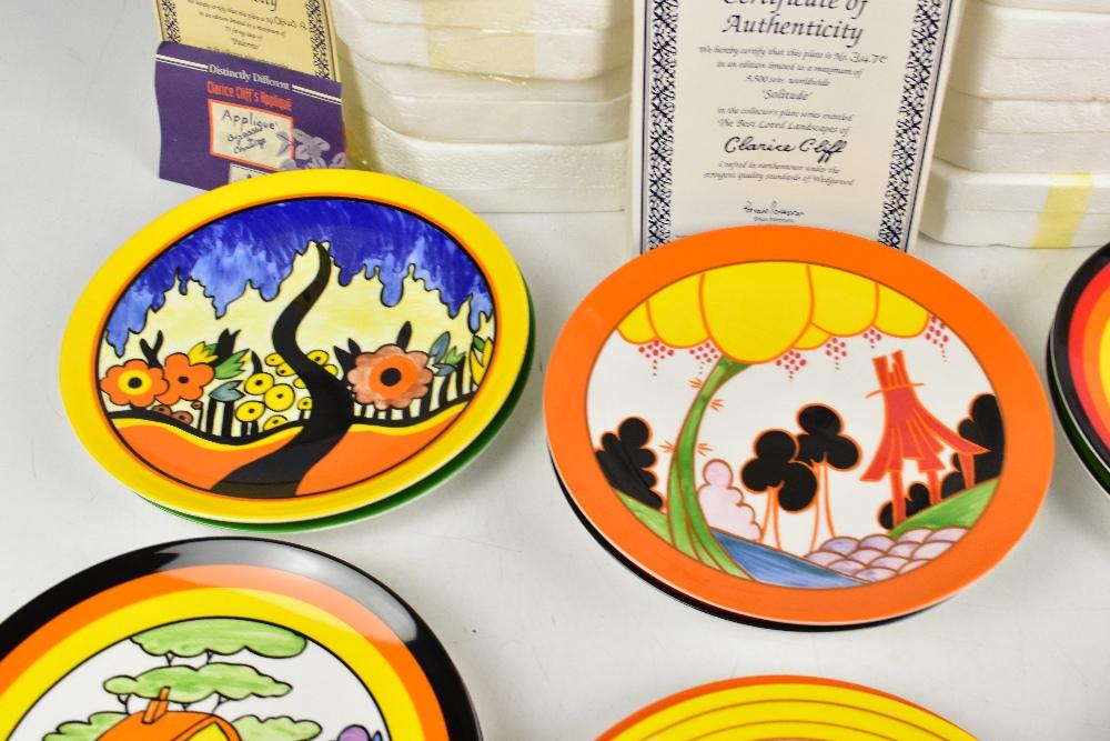 Lot 683 of 2095: BRADFORD EXCHANGE; a collection of twenty-two limited edition Wedgwood Clarice Cliff plates, each diameter 20cm, comprising 'Garden Blue', 'Honolulu', 'Fantastique Mountain', 'Blue Lucerne', 'Farmhouse', 'Orange House', 'Orange Roof Cottage', 'Red Roofs', 'Bridgewater', 'Windbells', 'Summerhouse', 'Poplar', 'House and Bridge', 'Red Tree', 'Monsoon', 'Caravan', 'Avignon', 'Lugano', 'Tulip', 'Eden', 'Windmill' and 'Palermo', some with polystyrene cases and many with certificates.
