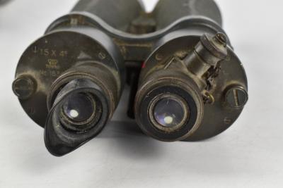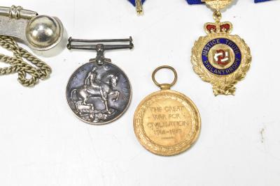 Lot 1226 of 2095: An assortment of military related items including two WWI medals awarded to Private GF Beresford North Staffordshire Regiment, a novelty photograph frame in the form of a propeller, arm patches, bosun's whistle, a pair of Japanese 15x40 binoculars etc.