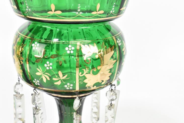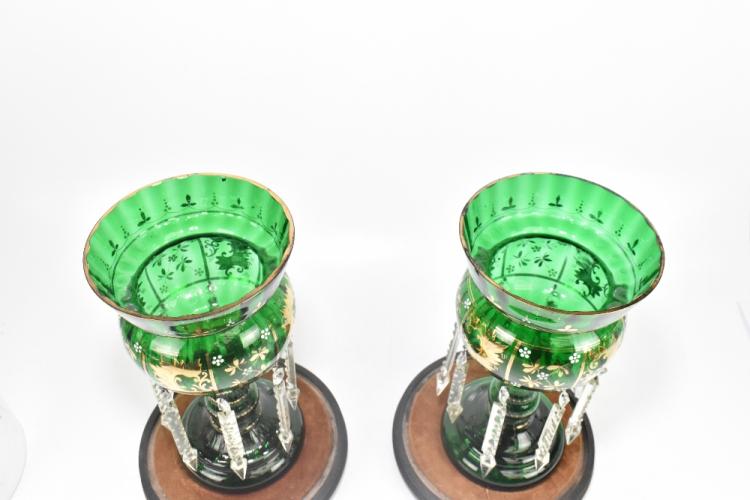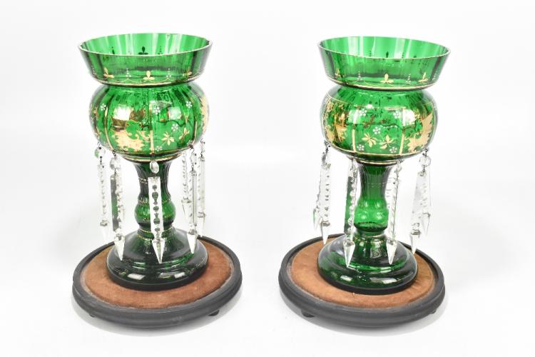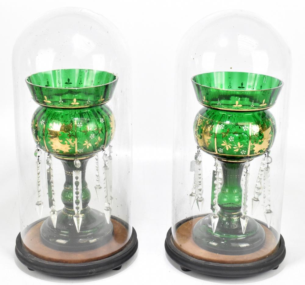 Lot 1504 of 2095: A pair of late Victorian green glass table lustres with enamelled and gilt floral detail with cut glass droplets, height 33cm, in glass domes and stands, overall height 50cm (2).