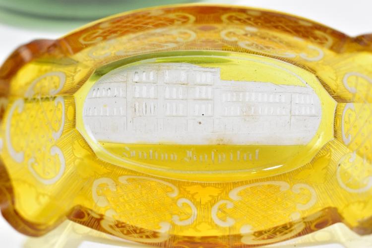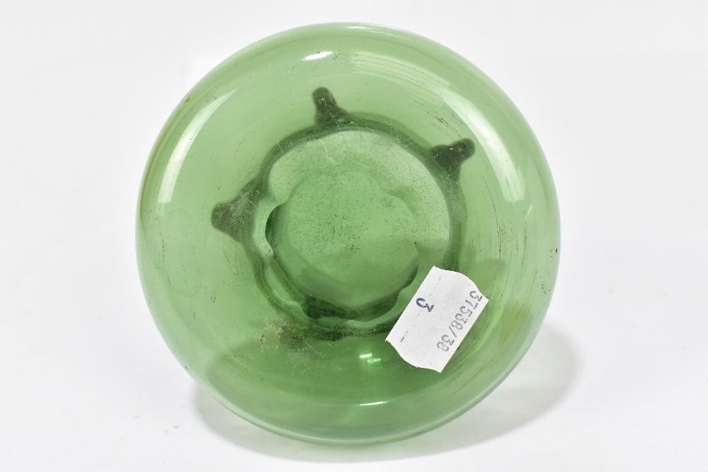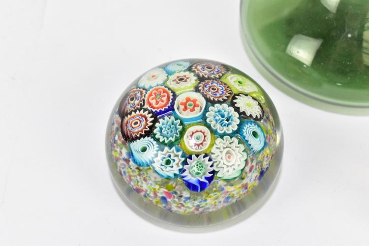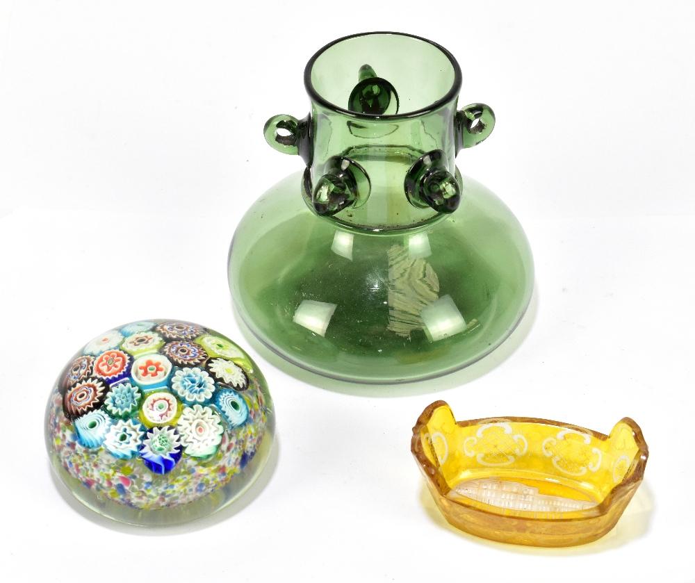 Lot 1510 of 2095: ATTRIBUTED TO STUART & SONS; an early 20th century green glass vase of bulbous form, the cylindrical neck with applied rings, height 10.5cm, a glass paperweight with millefiori type decoration, and a Bohemian glass bowl of oval form with etched decoration (3).