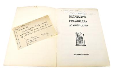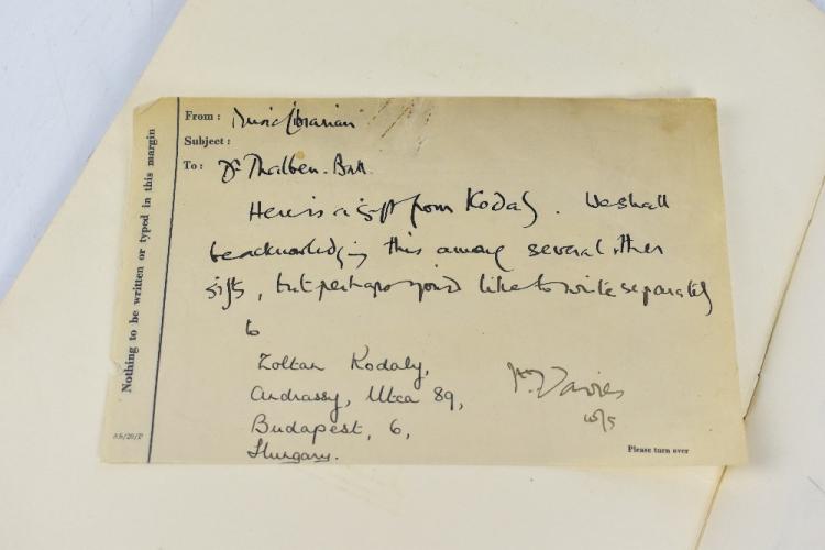 Lot 1523 of 2095: ZOLTAN KODALY (1882-1967); a printed short music booklet signed in pen by the composer on the title page, with a hand written telegram to George Thalben Ball referencing delivery of the signed music booklet (2)