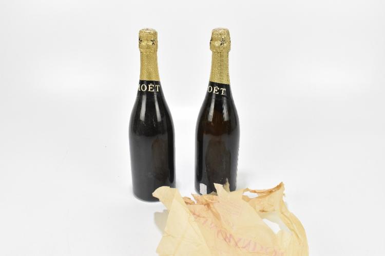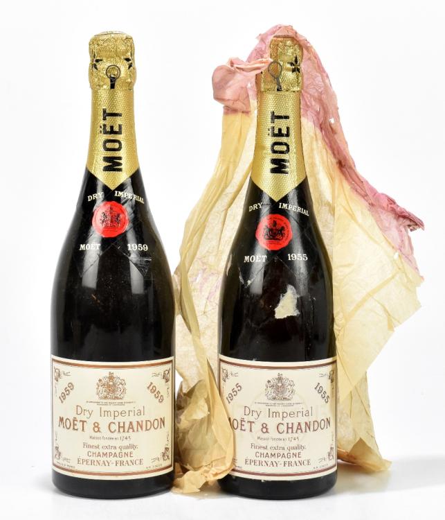 Lot 19 of 2522: CHAMPAGNE; two bottles of Moet & Chandon Dry Imperial Finest Extra Quality Champagne, 1955 and 1959, together with a single bottle of Dom Brial Muscat de Rivesaltes Vin Doux Naturel 1997, 75cl, 15% (3).