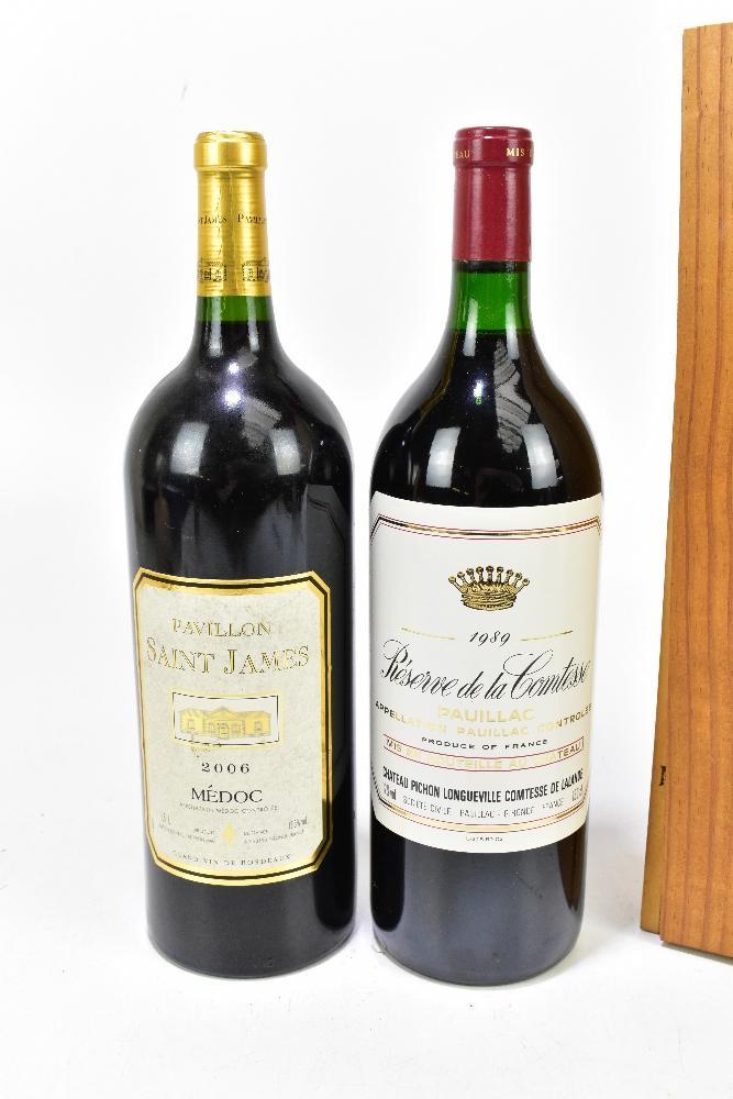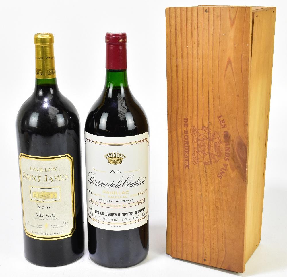 Lot 172 of 2522: FRANCE; two magnum bottles of red wine comprising Reserve de la Comtesse Pauillac, 150cl, 12%, in original wooden crate and Pavillon Saint James Medoc 2006, 1.5 litre, 12% (2).