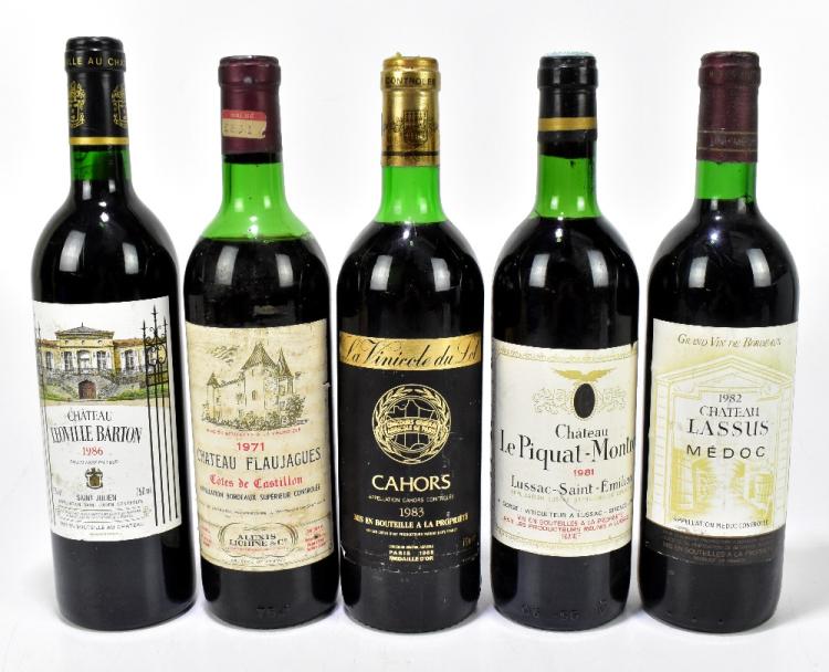 Lot 173 of 2522: RED WINE; five bottles, comprising 1986 Chateau Léoville Baron, 1982 Chateau Lassus Médoc, 1971 Chateau Flaujagues, 1981 Chateau Le Piquat-Montroc, and 1983 Cahors (5).