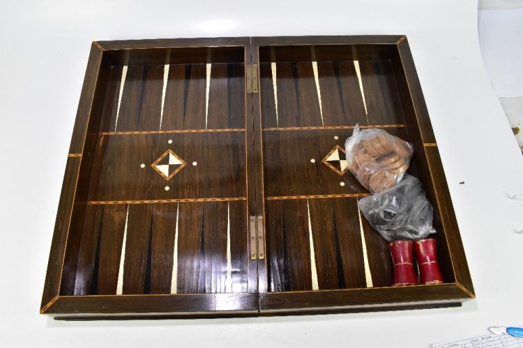 Lot 1002 of 2522: *****WITHDRAWN***** A good and large Victorian rosewood, satinwood and inlaid games compendium, the exterior set with chequered surface for chess and draughts, the interior ivory inlaid for backgammon and sold with two leather dice shakers and various draught pieces, when folded the case 60cm x 36.5cm.