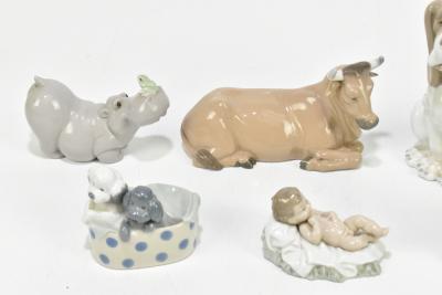Lot 1590 of 2522: NAO; a collection of seven animal models comprising a recumbent cow, hippopotamus, spaniel and cat, two dogs in a basket, a playful pup, a seated dog, a donkey and a further model of a baby in a manger (8).