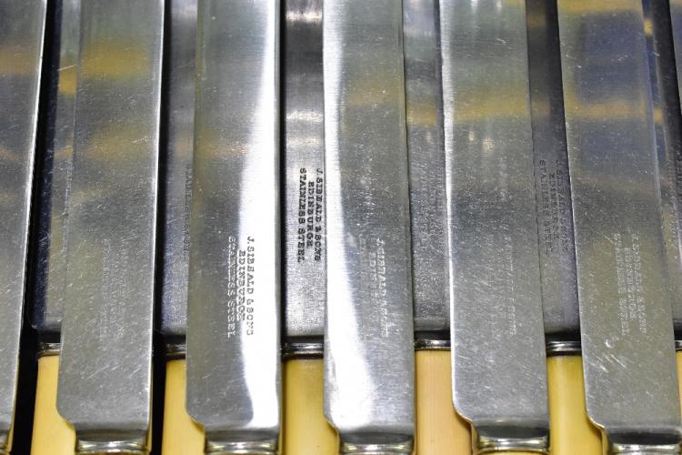Lot 23 of 2439: A canteen of stainless steel bladed carving knives and dinner and dessert knives with ivorine handles and various other knives.