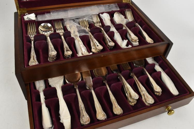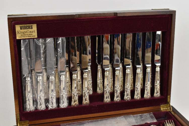 Lot 28 of 2439: VINERS; a King's pattern silver plated canteen of cutlery, in walnut case.