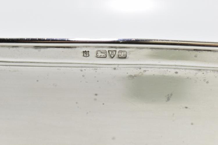 Lot 44 of 2439: A George V hallmarked silver dressing table tray of rectangular form with engraved initials 'EJW' to the central panel, Chester 1923, length 24.5cm, approx 9.25ozt/288g.