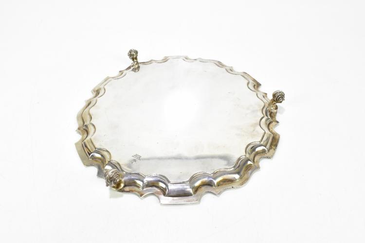 Lot 46 of 2439: WALKER & HALL; a hallmarked silver salver, on three scroll feet, Sheffield 1966, weight 30ozt/940g, diameter 31cm.