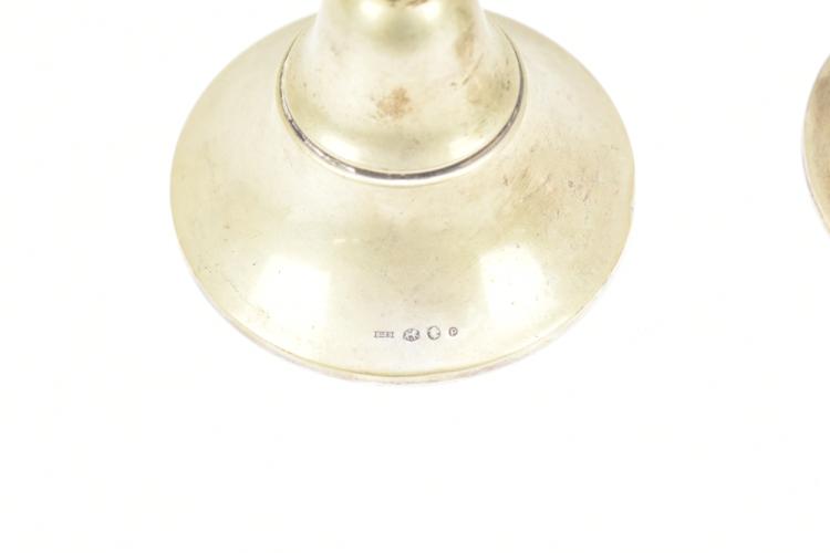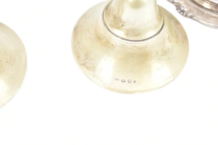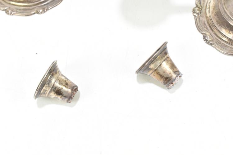 Lot 51 of 2439: A pair of hallmarked silver squat candlesticks, and a pair of sterling silver three branch candelabra, all with loaded bases.