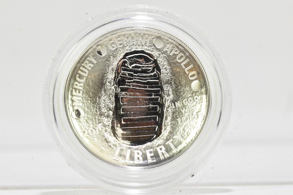Lot 868 of 2439: UNITED STATES MINT; a 2019 Apollo 11 50th Anniversary commemorative one dollar coin, in capsule and box, with certificate.
