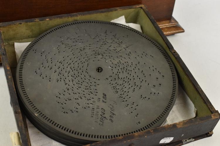 Lot 1137 of 2439: A late 19th century and later Polyphon type musical box, with eighteen 30cm discs, in a walnut case, case length 51.5cm.