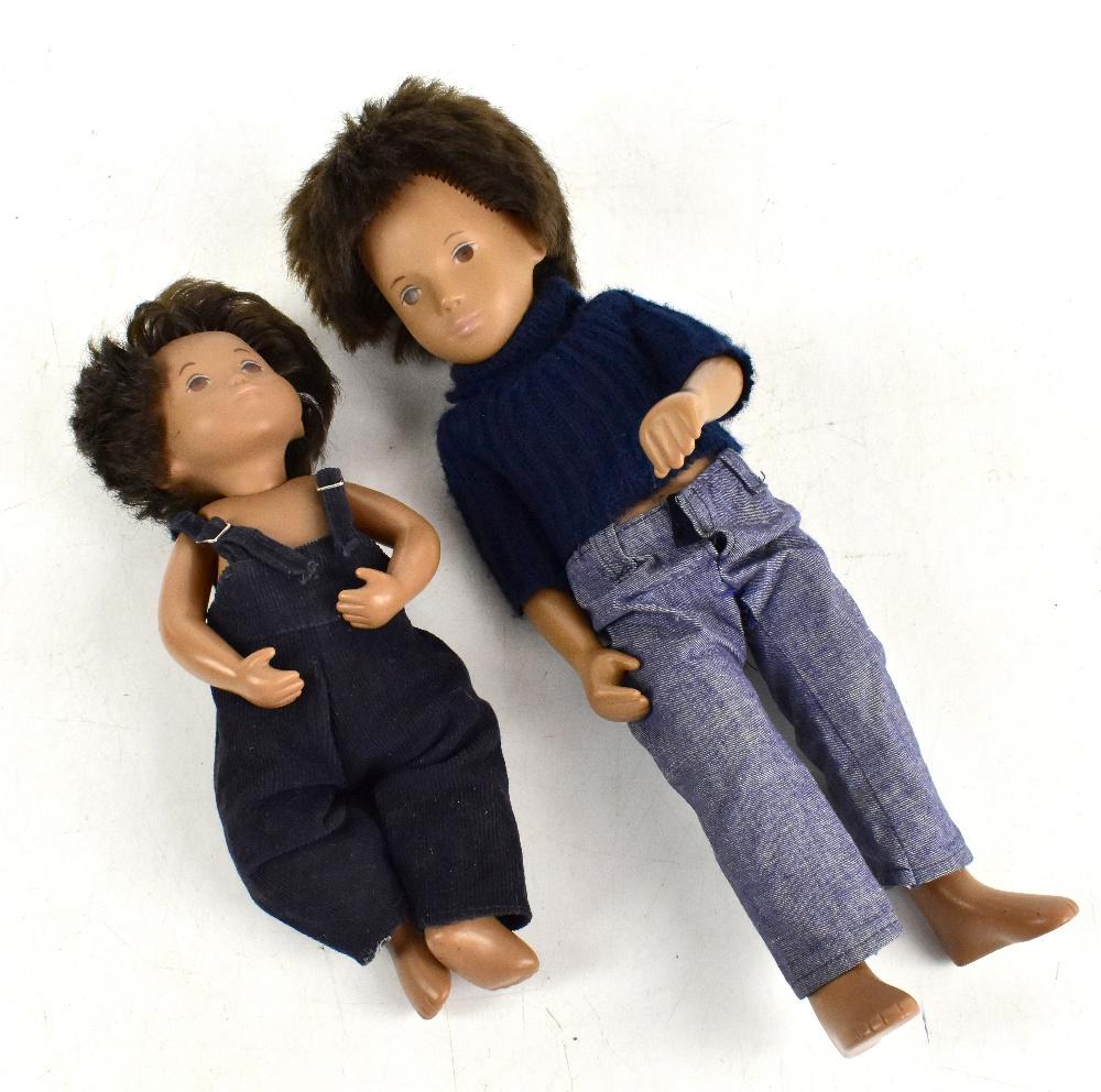 Lot 1144 of 2439: SASHA; two dolls comprising a boy doll in denim trousers, length 39cm, with a smaller doll in blue dungarees (2).