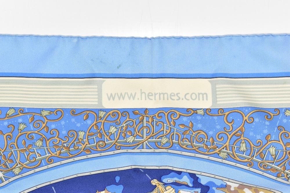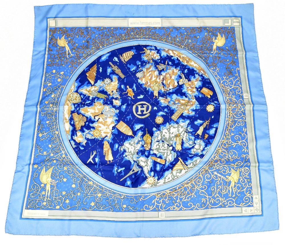 Lot 1661 of 2439: HERMÈS; a 100% silk 'Hermès.com' scarf in blue and cream with rolled hem, 90 x 90cm.