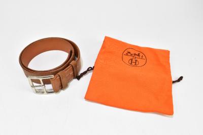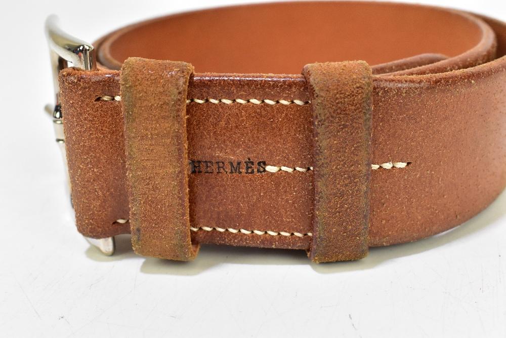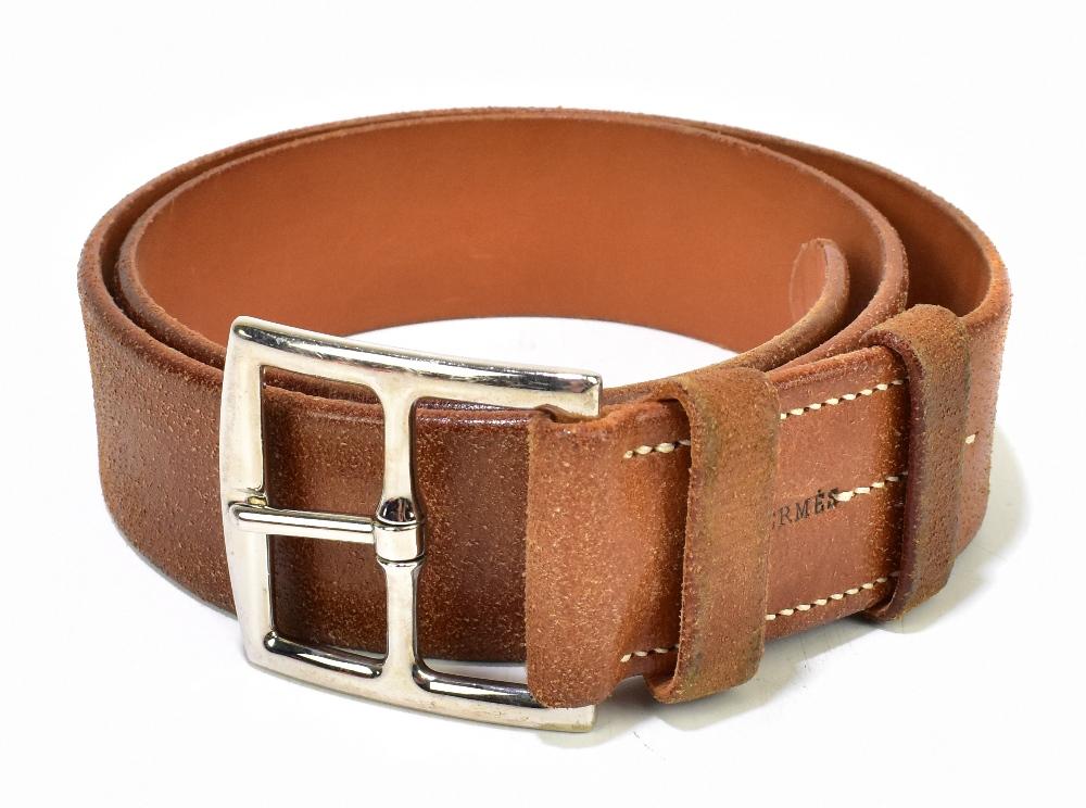 Lot 1673 of 2439: HERMÈS; a thick c.1998 tan leather belt, width 40mm, length 90cm, with a large silver toned buckle stamped 'Hermès' to the front, with tonal cream stitching and with authentic dust bag.