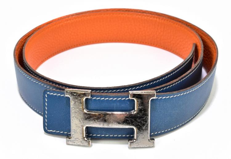 Lot 1680 of 2439: HERMÈS; a 2003 32mm 'H' buckle two tone reversible calfskin leather lady's belt with contrasting tonal stitching to each side, one blue soft leather and orange Epsom leather, stamped, with a silver tone 'H' buckle stamped with authentic buckle dust bag, length 95cm.