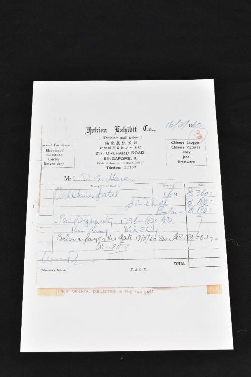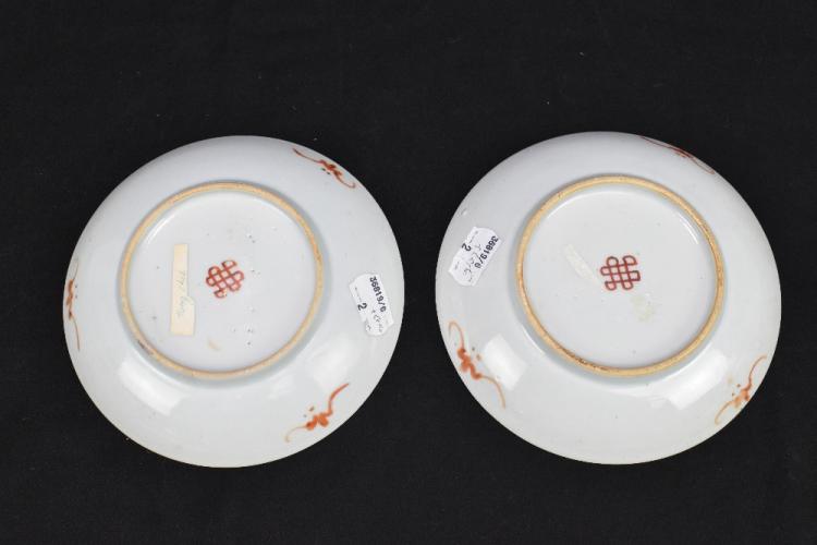Lot 48 of 1972: A pair of 19th century Chinese small shallow dishes, probably Tongzhi (1862-1874), each painted with flowers within a green and pale lilac surround and with painted marks to the reverse, diameter 14.5cm. Provenance: private collection in Surrey. Purchased from the Fukien Exhibit Co. Singapore in 1960 and sold with a copy of the receipt.