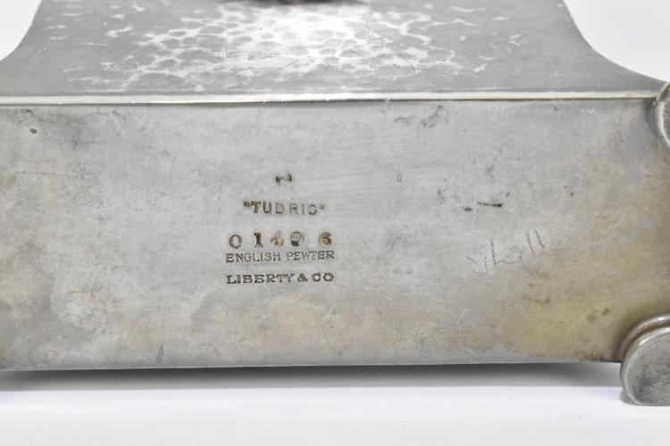 Lot 439 of 1972: LIBERTY & CO; a Tudric pewter eight day mantel clock, no.01406, with hammered shaped rectangular case, Arabic numerals to the circular dial and raised on four stepped feet, stamped to base 'Tudric, English Pewter, Liberty & Co', height 14cm. Provenance: private collection north-west.