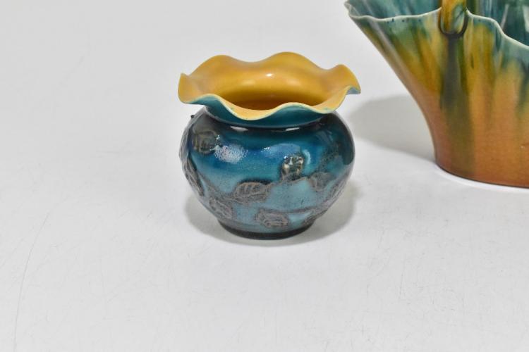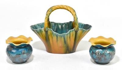 Lot 647 of 1972: LINTHORPE; an Art Pottery basket with wavy edge and turquoise glazed interior, numbered 1788, height 17cm, width 23cm, together with a pair of squat vases with piecrust wavy rims, height 7.5cm (3).
