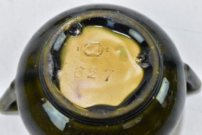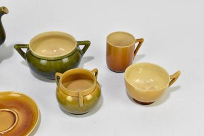 Lot 648 of 1972: LINTHORPE; a collection of Art Pottery including a teapot of baluster form, a twin handled cauldron shaped sugar bowl, a coffee can and saucer, a tea cup and saucer, also a Linthorpe style three handled vase (7).