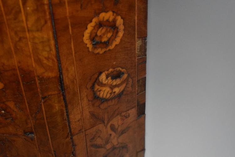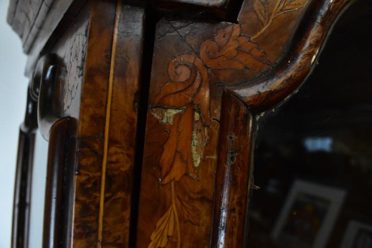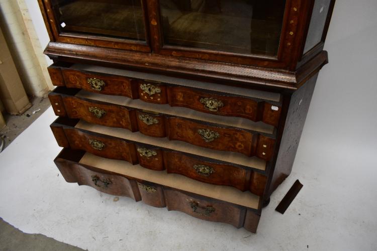 Lot 2060 of 1972: A 19th century Dutch marquetry inlaid display cabinet with shaped moulded cornice and central scrolling detail, above a pair of shaped glazed doors and glazed sides, enclosing an arrangement of three shelves above the base section with four drawers on later bun feet, with floral inlaid detail, height 220cm, width 146cm, depth 39cm.