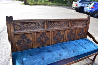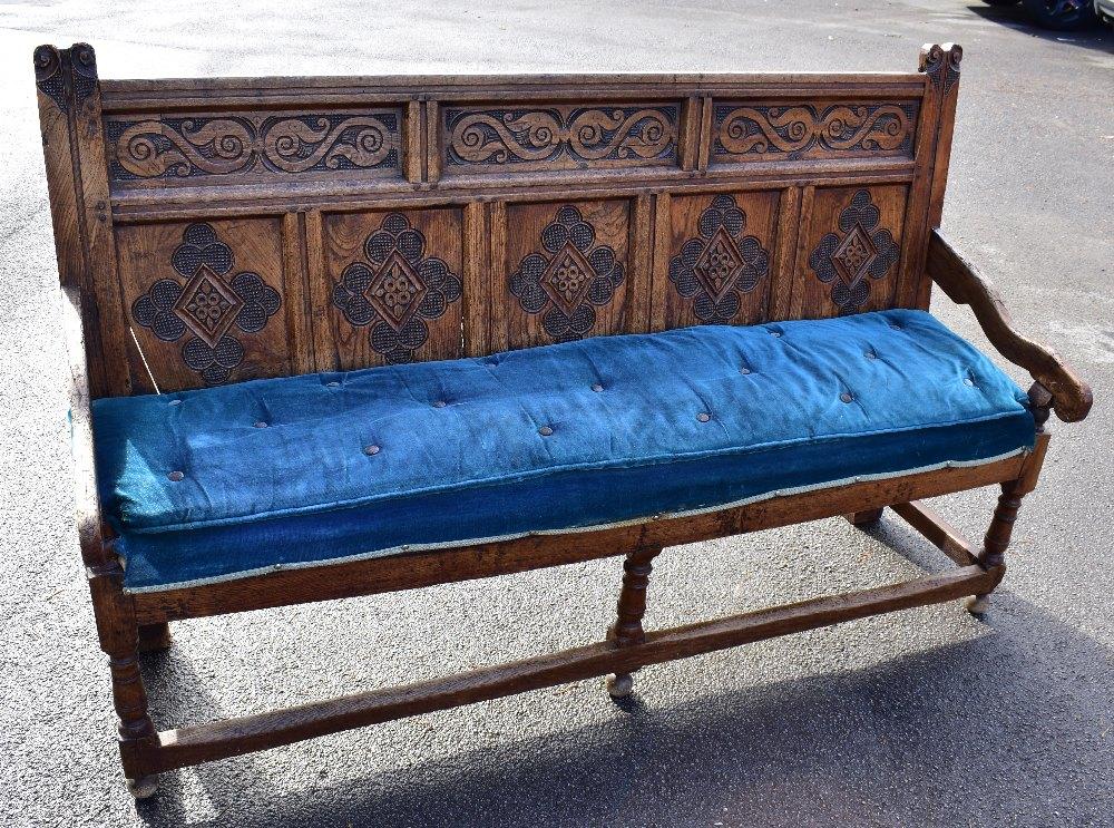 Lot 2247 of 1972: A 17th/18th century carved oak settle with panel back and upholstered seat on turned stretchered supports, width 176.5cm.