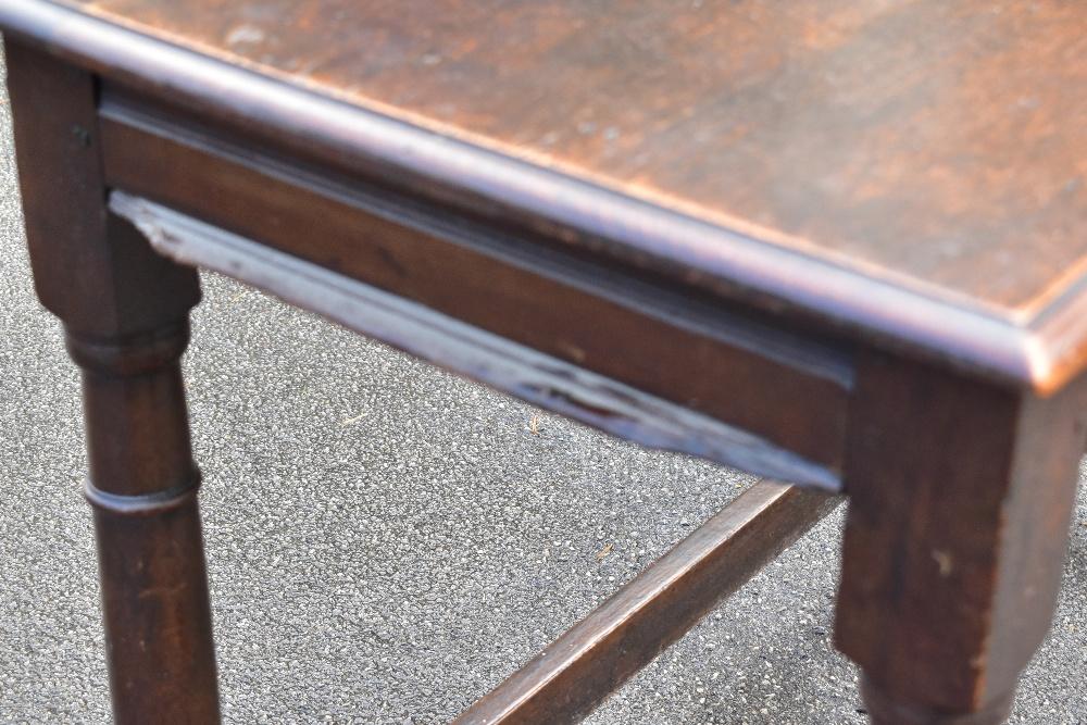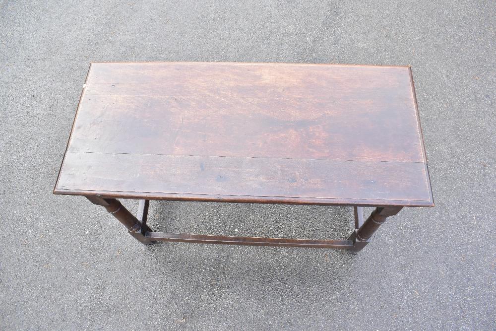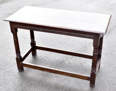 Lot 2248 of 1972: An 18th/19th century oak hall/side table with rectangular top above carved frieze with initials 'ETEE' on turned stretchered supports, width 127cm, depth 58cm, height 86cm.