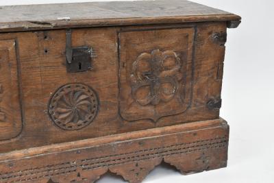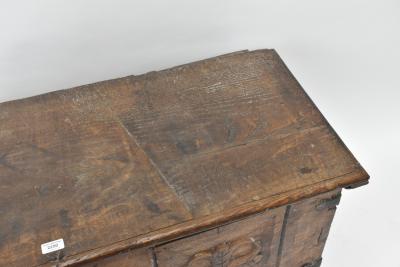 Lot 2250 of 1972: An 18th century stained and carved pine coffer with hinged lid, width 124cm, depth 50cm, height 60cm.