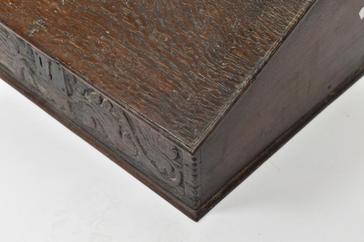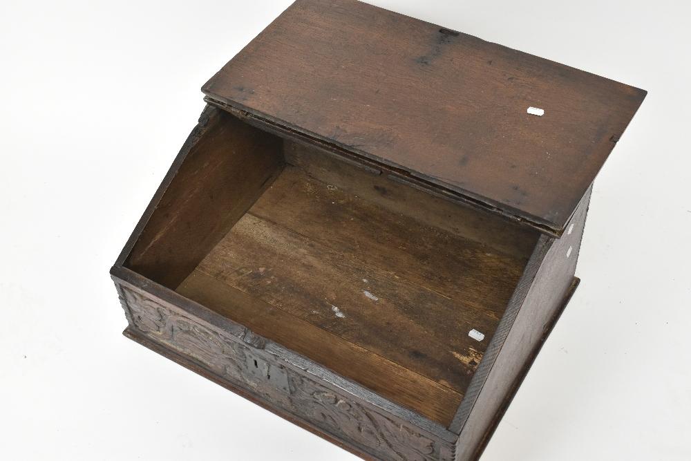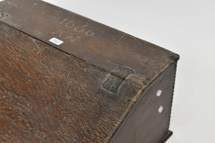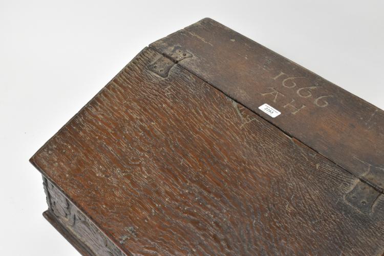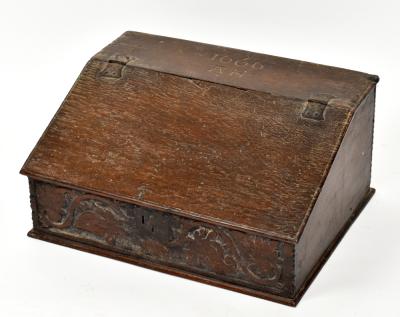 Lot 2253 of 1972: An 18th century oak bible box, carved 1666 AH and with sloping hinged lid, width 63cm, depth 48cm, height 29cm.