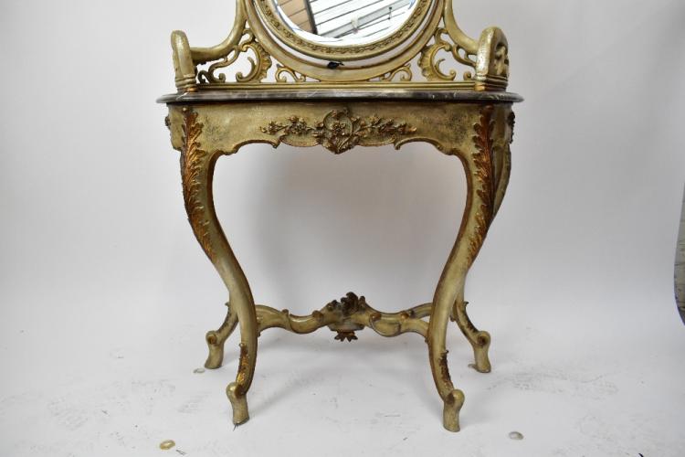 Lot 2348 of 1972: A decorative reproduction French style dressing table with oval bevelled mirror back above marble top, on cabriole supports, width 96cm, height 140cm to top of mirror.