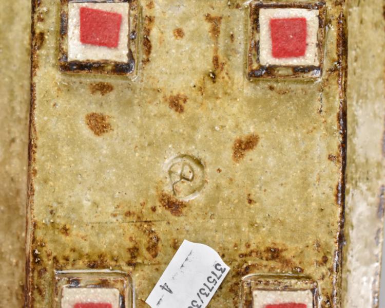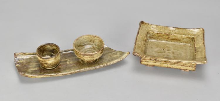 Lot 34 of 947: ALAN BIRCHALL (born 1945); a stoneware olive dish set comprising two bowls and a tray covered in Cedar of Lebanon ash glaze over red slip, impressed AB mark, tray length 25.5cm, and a rectangular footed dish covered in apple ash glaze over red slip, 16 x 13cm (4). (D)