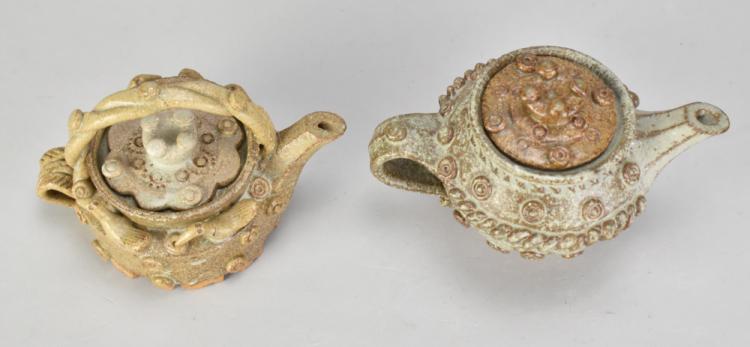 Lot 295 of 947: IAN GODFREY (1942-1992); two small stoneware teapots, one decorated with birds, tallest 9cm. (D)