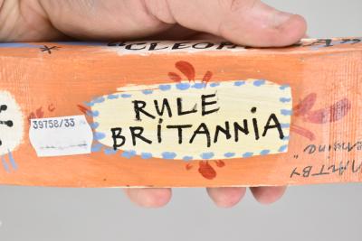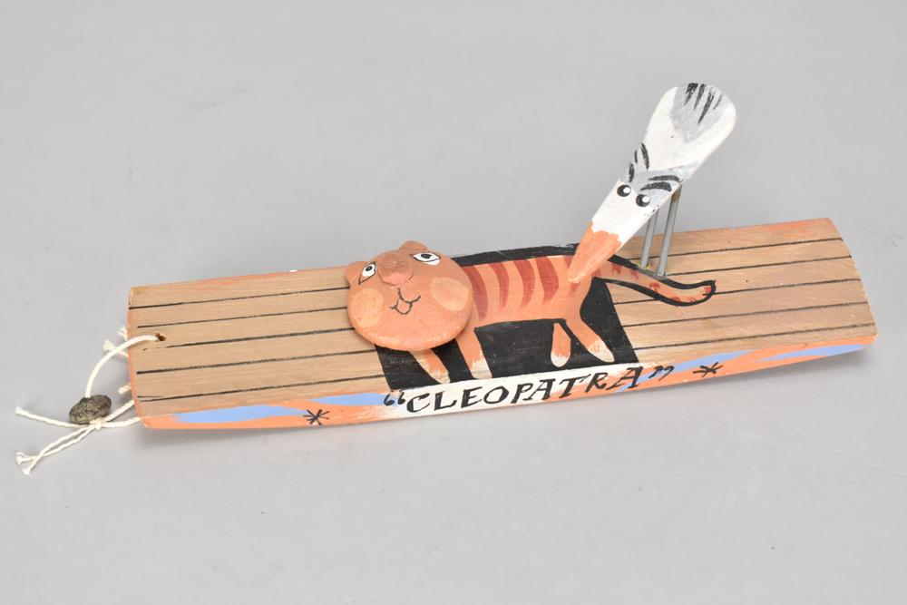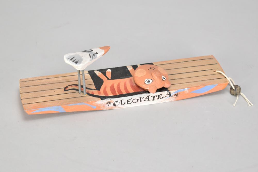 Lot 452 of 947: JOHN MALTBY (1936-2020); 'Rule Britannia', a stoneware sculpture of a cat and seagull mounted on a wooden boat 'Cleopatra', inscribed title and signature, also inscribed 'genuine', length 25cm. (D)