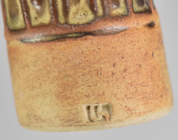 Lot 516 of 947: LOUIS HUDSON; a square stoneware slab vase with impressed decoration, impressed LH mark, height 20cm, and two matching cylindrical vases, tallest 19.5cm (3). (D)