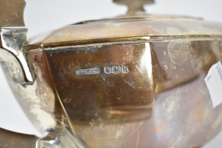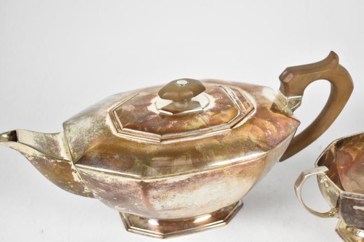 Lot 6 of 4047: OLLIVANT & BOTSFORD; a hallmarked silver four piece tea service, of Art Deco design with bakelite handles and finials, Sheffield 1950, combined approx. 48.5ozxt/1540g (4).