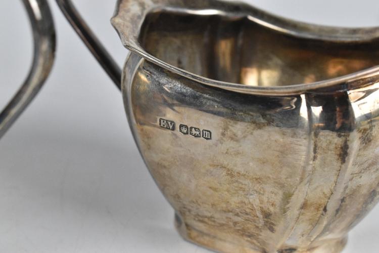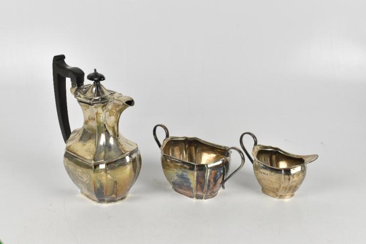 Lot 11 of 4047: VINERS; a hallmarked silver three piece coffee service, the coffee pot with ebonised finial and handle, Sheffield 1911, gross weight 34ozt / 1071g, (3).