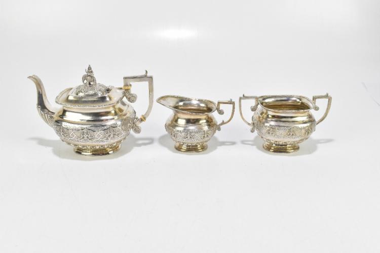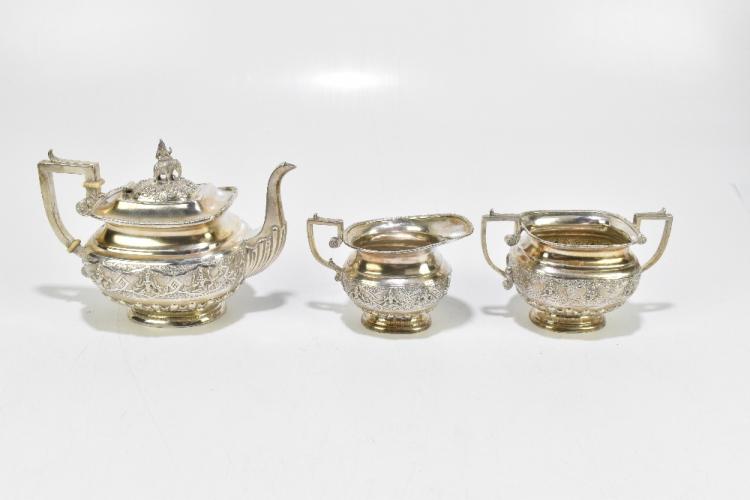 Lot 19 of 4047: An Edwardian Anglo-Indian white metal three piece tea set, the teapot with finial modelled as a figure and an elephant, the handle with two ivory insulators, all decorated with a band of deities, stamped to the underside, 'T.P.R & Co Bombay', gross weight 27ozt / 854g (3)  CITES reference number B69DUV43