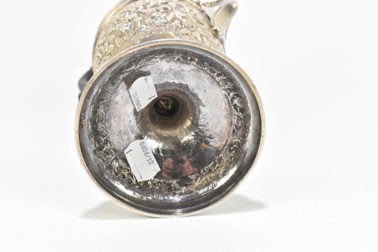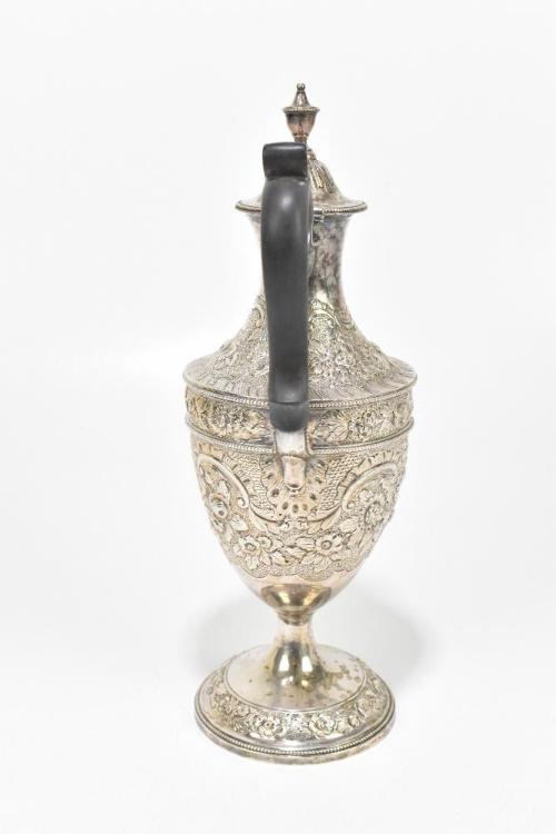 Lot 25 of 4047: A George IV hallmarked silver coffee pot with urn finial and cast beaded rims, repoussé decorated with floral sprays and scrolling detail, London 1821, height 33cm, total weight 27.18ozt/845g. Provenance: Adlington Hall Cheshire