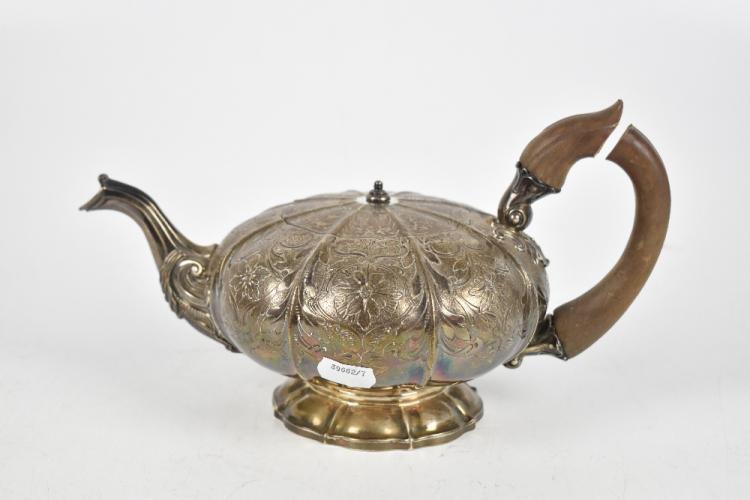 Lot 27 of 4047: WILLIAM EATON; a George IV hallmarked silver foliate engraved melon shaped teapot, with wooden handle, London 1824, length 27.5cm, approximately 25.56ozt/795g.