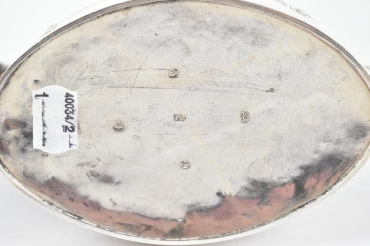 Lot 28 of 4047: A George III hallmarked silver oval teapot, with embossed floral and scroll detailing, carved wood handle and finial, London 1796, 14.5ozt/455g, height 14.5cm.