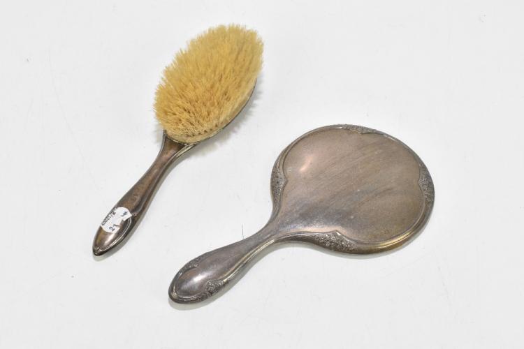 Lot 31 of 4047: A George V hallmarked silver mounted dressing table mirror and a similar brush, the mirror Birmingham 1919, length 26cm (2)