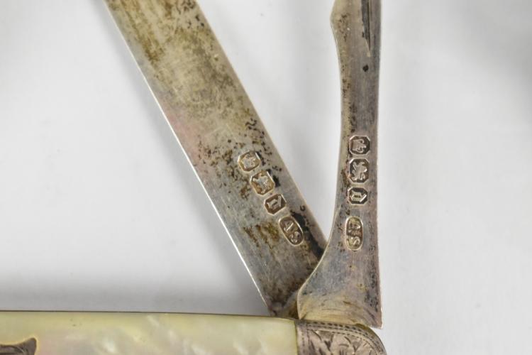 Lot 52 of 4047: A late Victorian hallmarked silver and mother of pearl bodied two blade knife, Sheffield 1896, a George V hallmarked silver tortoiseshell mounted pill box, London 1929, a Continental white metal snuff box and a Continental white metal small dish (4).
