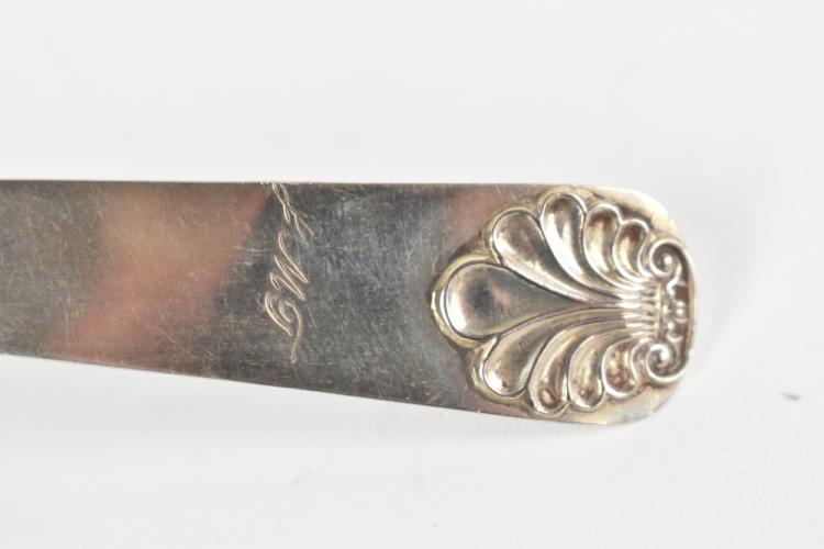 Lot 57 of 4047: A 19th century white metal small ladle, with applied shell to the terminal above engrave initials 'JMJ', with gilt washed interior to the bowl, struck twice with the maker's mark 'JF' in a rectangle, length 16.5cm, approx. 0.97ozt/30g.